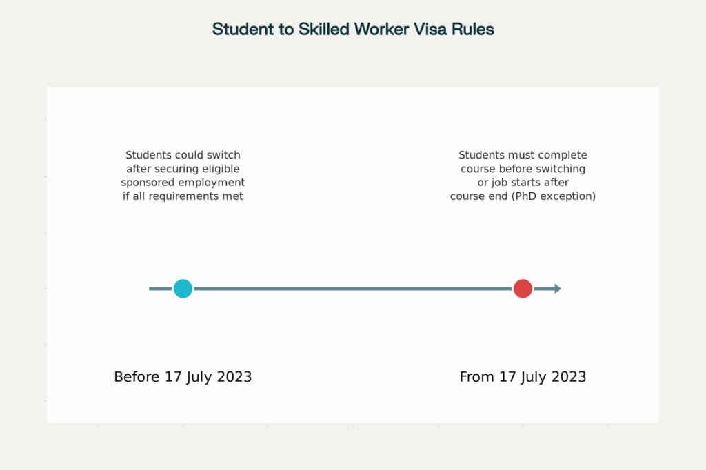 Moving from the Graduate route is simpler than switching straight from a Student visa because course-completion checks disappear; your right to stay has already been confirmed. The deal-breakers now are salary, skill level and sponsorship.